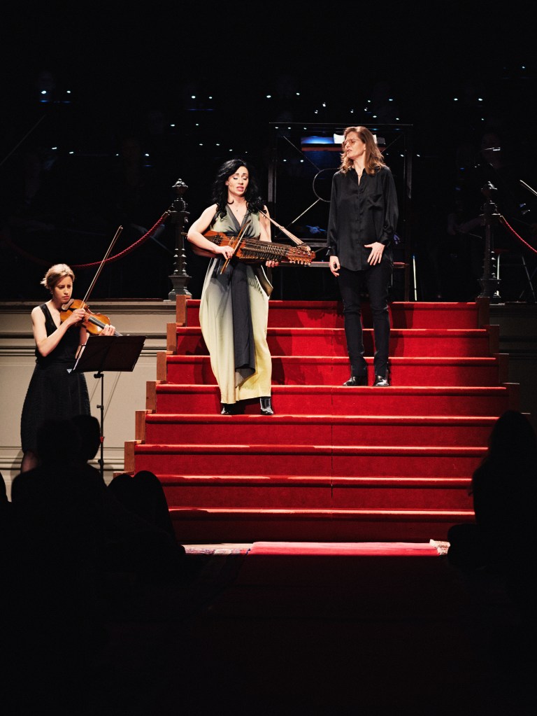 “But the highlight is the intermezzo between these two pieces, when Patoulidou comes forward from the back of the room with the key harp. Together with violinist Vilde Frang (who will solo in Berg’s Violin Concerto the following days) and Hannigan as singer, an Icelandic folk song will be played. Three women in the spotlight on the red stairs in front of the trestle: a powerful image.”