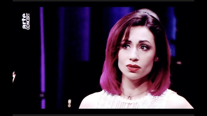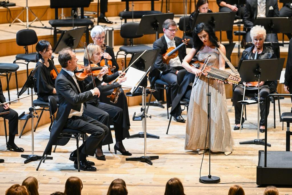 “She opens the evening with a Greek folk song she has arranged. She accompanies herself with a traditional instrument, a kind of harp or dulcimer, which she holds in her hands and plucks. She is standing on one of the balconies among the spectators. Gracefully, almost intimately and naturally, the tones flow together to form a melody. Most of the time she stays in the high register, which benefits her soft, bright soprano tone”