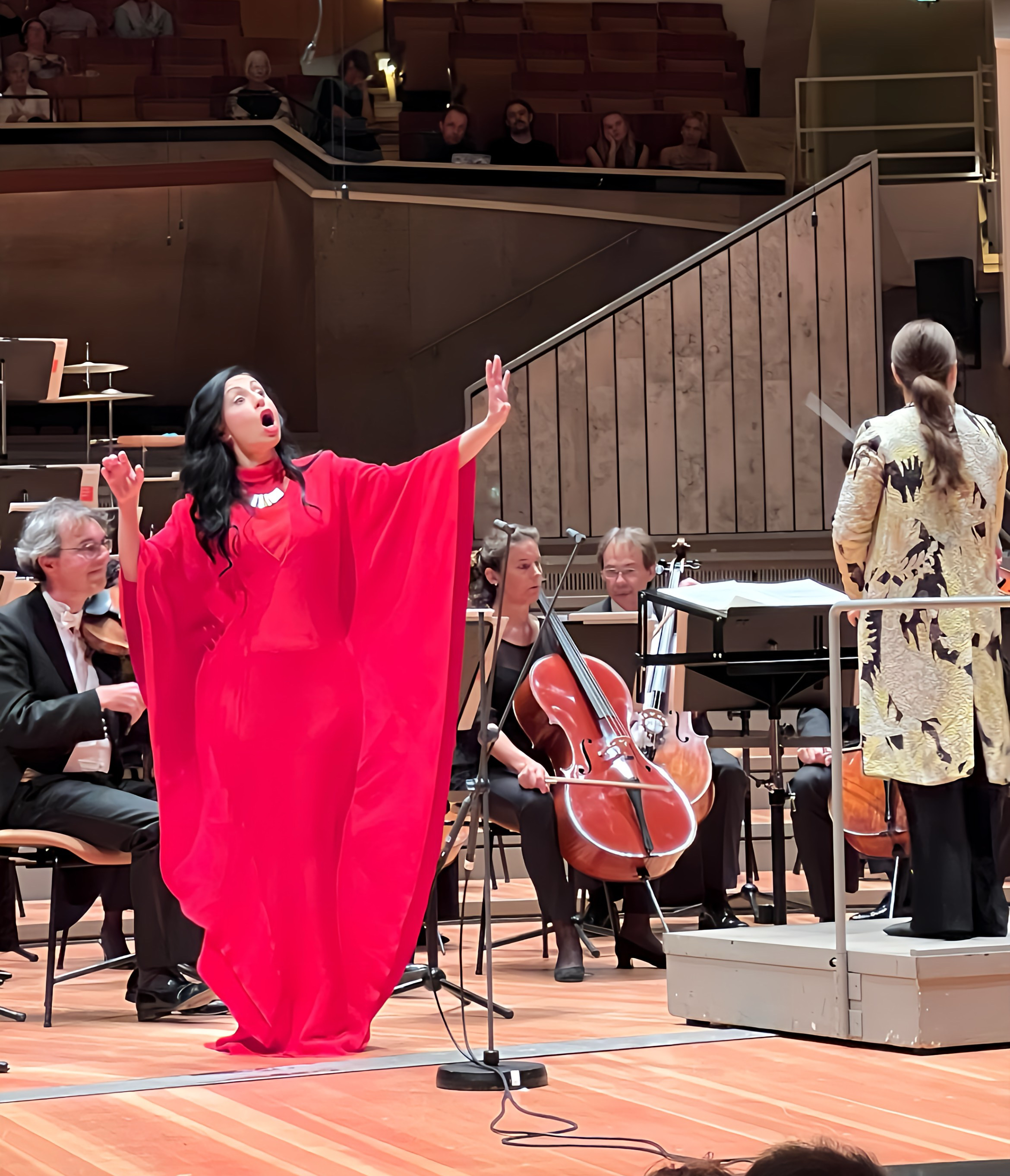 “Aphrodite Patoulidou gave an impressive Philharmonie debut. She not only sang in an understandable way with a clear, beautiful and confident voice, but also designed every line of the childishly naive lyrics that tell of the “heavenly joys”. She was accompanied sensitively by the orchestra – let’s not forget that a fellow singer made sure that the voice was always present over the orchestra. By the way, the Vita of Patoulidou is interesting to read: her repertoire not only ranges from Purcell to Claude Vivier, but she occasionally sings heavy metal and is also artistically versatile outside of music.”