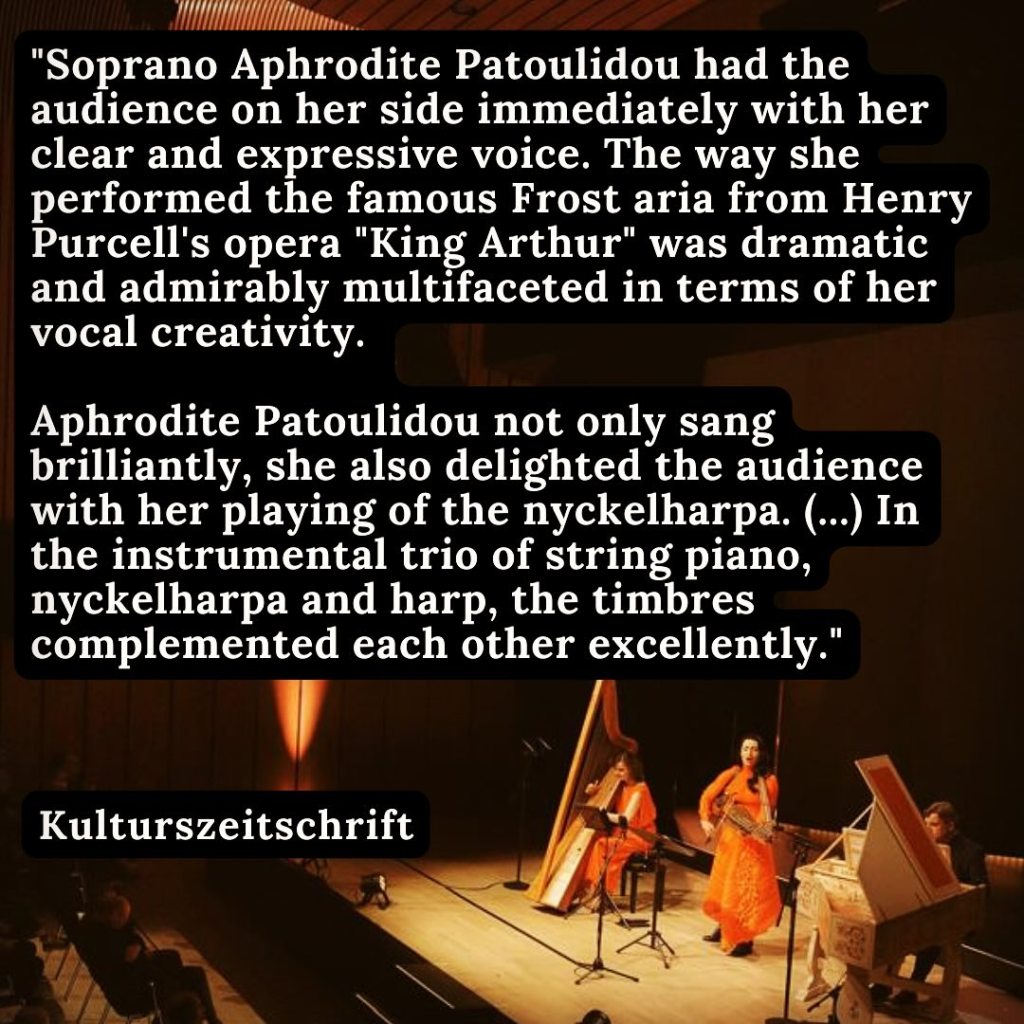 “The naked, self-revealing tone of the concert, however, was set from the beginning, surprisingly, when Patoulidou from a position outside the hall performed a Greek lullaby with her own accompaniment on key harp (!).”